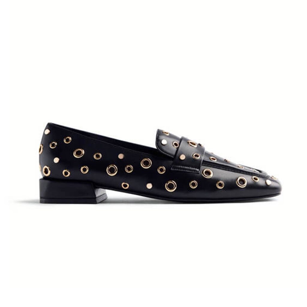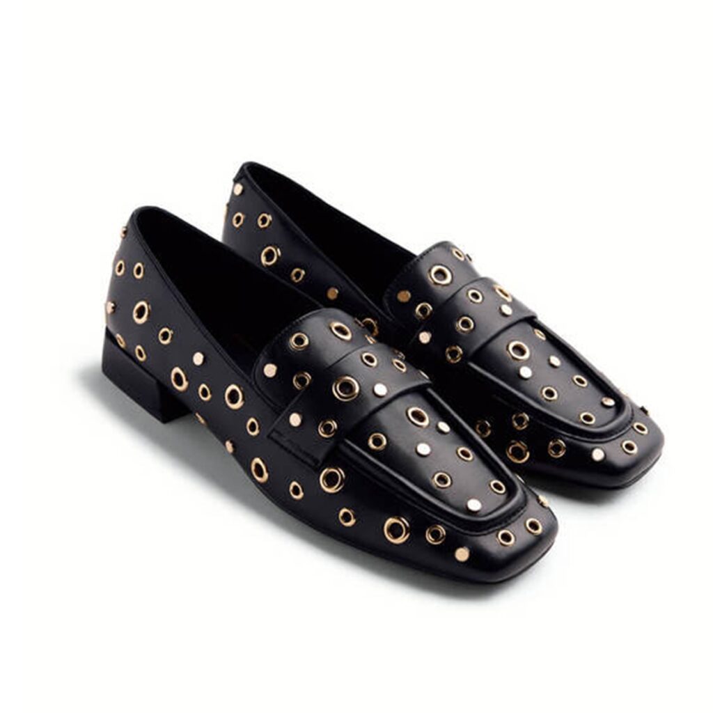 בין הדגמים הבולטים ניתן למצוא מוקסינים עשויים עור איכותי בצבע שחור קלאסי, המעוטרים בטבעות מתכת בגוון זהב שמעניקות מראה מתוחכם ודרמטי, לצד גרסה מונוכרומטית עם ניטים שחורים קטנים היוצרים טקסטורה עשירה ומעניינת. השילוב בין גזרה אלגנטית לנגיעות רוקיות יוצר זוג נעליים שגונב את ההצגה, בין אם מדובר במראה יום-יומי עם טוויסט או באאוטפיט ערב מלא נוכחות. טווח מידות: 36- 41. המחיר: 399 שקלים לזוג.